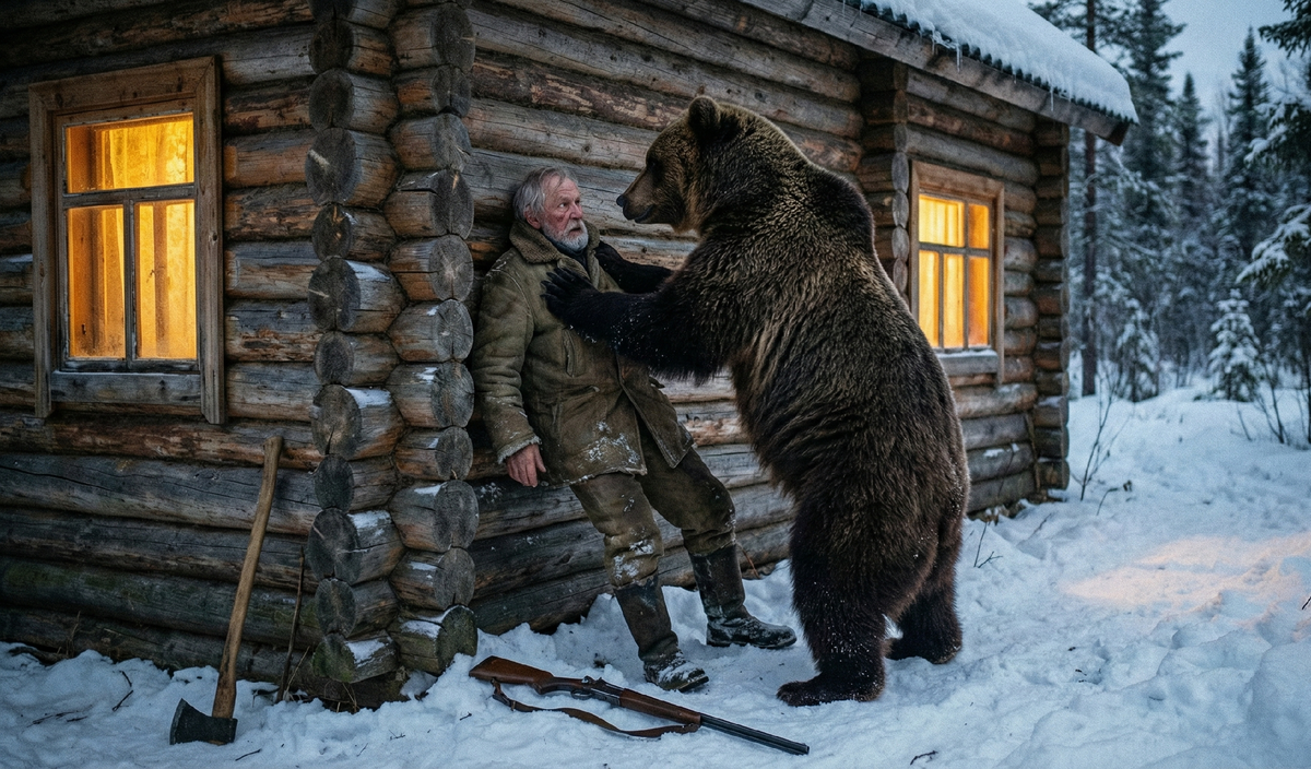На лесной опушке, метрах в двадцати от дома, в утреннем тумане стоял огромный, как скала, бурый медведь. Его густая шерсть лоснилась от здоровья и сытости, а на широкой морде отчетливо белел старый, заросший шрам — память о далеком и жестоком прошлом.