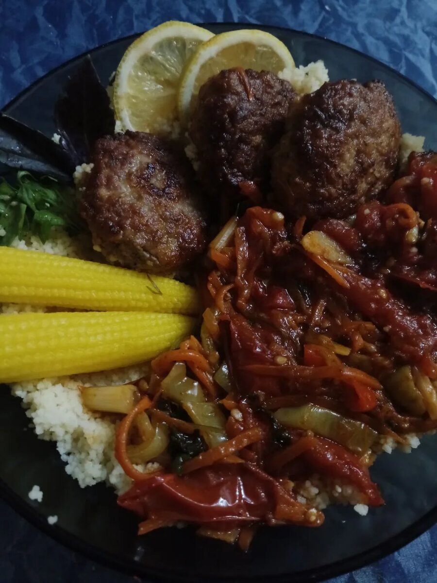 Всем рекомендую попробовать. Блюдо в стиле Ближнего востока. Сытное. Готовить не сложно. Ингредиенты: 1 пакетик кускуса 80-100 гр. крупный помидор нарезка кубиками. болгарка нарезка полукольцами. 2 кружка острого перца. зубчик чеснока. 3 кружка лимона. стели от зеленого лука. корейская морковка 30 гр. зелень:петрушка, базилик. Масло для жарки. мука для панировки биточков. 2 маринованные кукурузки для украшения. Специи: чёрный перец, сельдерей, кинза, паприка. Рубленое мясо 200-300 гр. баранина или телятина. (фарш крупного помола то же подойдёт,но вкус немного измениться) Приготовление. Залейте кускус кипятком по инструкции. Оставьте настаиваться. мясо очень мелко порежьте и отбейте молоточком. Соль по вкусу. Специи кроме паприки.Сформируйте биточки типа круглых приплюснутых котлеток не крупные. Обжарьте биточки на масле и дотушите под крышкой 5-10 минут. Потушите овощи слегка обжаривая. добавьте резаный кубиками или полу кольцами помидор. Добавьте специи Чуть выдавите сок с одного к