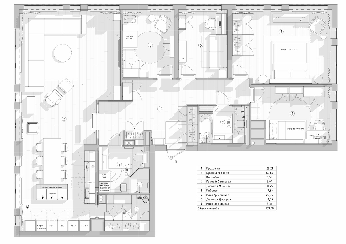 Проект создавался для молодой семьи с двумя детьми, в которой также предусмотрено место и для пятого ее члена — корги. Заказчики хотели просторную квартиру с гостевой комнатой, отдельным рабочим местом и большой зоной хранения для одежды, так как это всегда насущная проблема для семей с детьми. Также, им хотелось добавить интересных цветов в их будущий интерьер. Заказчики отдали предпочтение не столь популярному сейчас стилю — лофт, который, однако, отвечает их запросам как нельзя лучше — приветствует интересные цветовые решения, нестандартные, где-то «сырые» отделочные материалы, а также дает волю фантазии и остается, при всем этом, уютным. Визитная карточка квартиры — большая кухня-гостиная площадью 60 кв м. Кухня имеет свою небольшую кладовую, которую можно использовать как место для хранения круп, банок с вареньем и заготовок на зиму. Доступ к ней простой — через сдвижную дверь. Кухня-гостиная получилась с большим количеством естественного света, поэтому ее интерьер выглядит более
