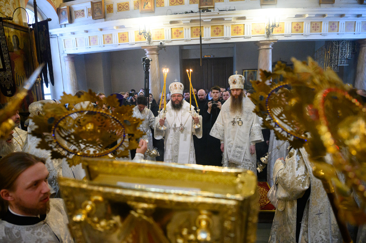 Песнопения Литургии исполнил братский хор под управлением монаха Антония (Лисова) и Архиерейский хор Псково-Печерского монастыря под управлением Марии Быковой. За богослужением молились: митрополит Евсевий (Саввин