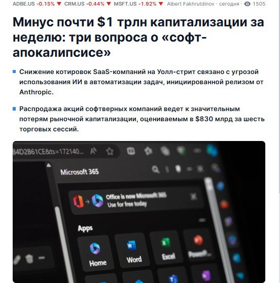 от ИИ и спровоцировало распродажу, которую трейдеры окрестили SaaS-апокалипсисом (или «софт-апокалипсисом») Обвал котировок в секторе программного обеспечения и IT-услуг продолжается на Уолл-стрит 6 сессий подряд. За это время он уничтожил около $830 млрд рыночной стоимости. Bloomberg объясняет, что представляют собой SaaS-компании, почему искусственный интеллект угрожает их бизнесу и как, казалось бы, безобидный инструмент от Anthropic стал катализатором паники на фондовом рынке. Что такое SaaS-компании и почему их акции рухнули? Разработчики Software-as-a-Service (программное обеспечение как услуга) предоставляют клиентам доступ к своим приложениям через интернет, взимая абонентскую плату вместо традиционной продажи лицензий. Microsoft #MSFT, Salesforce #CRM, Adobe #ADBE и другие гиганты индустрии построили бизнес на этой модели, обеспечивая клиентам обновления и поддержку в обмен на стабильные платежи. В конце января 2026 года давление на сектор резко возросло после того, как Ant