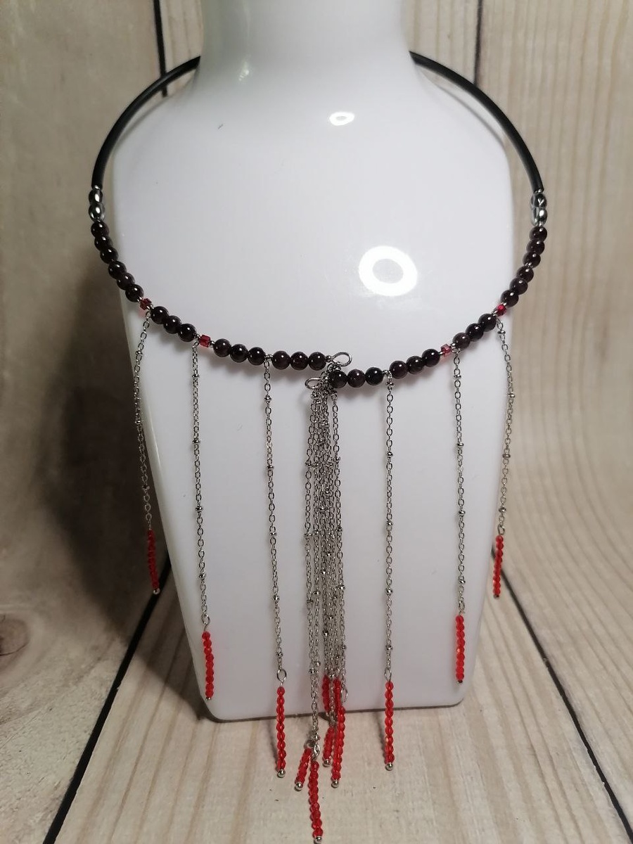 ? Колье-чокер с бусинами из граната на мемори-проволоке и шпинелью на цепочках Элегантное колье-чокер, сочетающее в себе изысканность и современный стиль. Основа украшения выполнена на прочной и гибкой мемори-проволоке, которая идеально облегает шею, сохраняя форму и не причиняя дискомфорта. Главная изюминка изделия — бусины из натурального граната, аккуратно выложенные в один ряд по окружности чокера. Глубокий, насыщенный оттенок гранатовых бусин придаёт украшению роскошный и немного загадочный вид. Гранат традиционно ассоциируется с энергией, страстью и защитой, что делает это колье не только стильным аксессуаром, но и своеобразным талисманом. От чокера изящно свисают несколько цепочек разной длины, создавая эффект динамичного каскада. Цепочки выполнены из качественного металла с серебристым покрытием, которое гармонично сочетается с тёмным гранатом. На цепочках искусно размещены вставки из красной шпинели — эти блестящие акценты добавляют украшению глубины и выразительности.