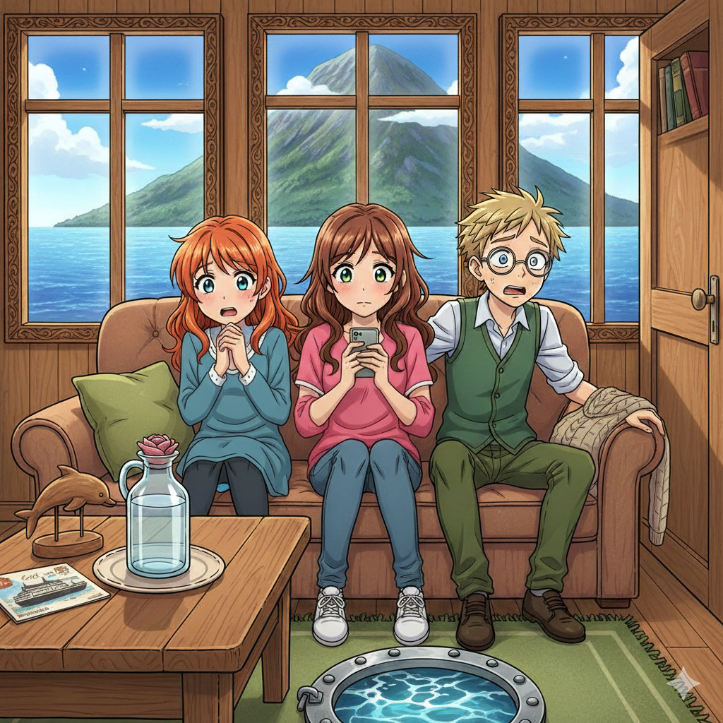 «Наверное, чтобы не мыть потом два стакана, - решила Катя». Парень что повыше отпил немного воды и протянул стакан второму парню. Тот сделал глоток и поставил стакан на стол. Катя заметила удивление на лице Бори и Оли. Потом незнакомцы стали вести себя еще более странно. Все трое встали на зеленый коврик и взялись за руки. Тот, что был выше всех, стал читать что-то вроде заклинания. Катя решила, что сейчас домик в море взлетит, и они полетят куда-нибудь еще. Но ничего не произошло. Ребята продолжали стоять, держась за руки.