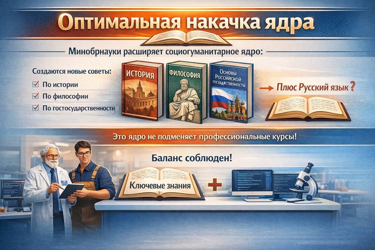 ❗️Минобрнауки планирует расширить объем дисциплин социогуманитарного ядра. В него, как озвучил замминистра Константин Могилевский, войдут: История, Философия и Основы российской государственности. Сюрпризов здесь нет. ➡️Он сообщил, что при Минобрнауки уже функционирует совет по развитию исторического образования. Скоро будут созданы еще два – по философии и Основам российской государственности. ➡️Несмотря на существования вектора усилий по расширению социогуманитарного ядра — в Минобрнауки существует четкое понимание того, что это именно ядро, оно не должно подменять собой профессиональные курсы. ➡️Само по себе ядро действительно существует уже давно – через общеобязательные курсе в виде Истории России, Философии и т.п. ➡️Еще одним обязательным предметом является Русский язык – ему посвящен отдельный перечень поручений президенту. Складывается ощущение, что дисциплина уверенно движется в сторону вхождения в социогуманитарное ядро. Содержание поручений пусть об этом и не указывает н