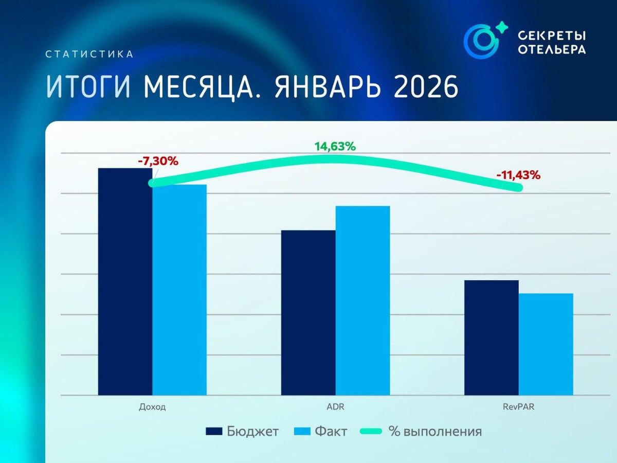Итоги января 2026 Подводим итоги первого месяца года в отелях, где команда «Секреты отельера» управляет доходами "под ключ". Перед вами результаты двух объектов - очень разных по продукту, позиционированию и стадии развития. Отель №1. Подмосковье, 50 номеров. С объектом работаем не первый год. Позиция на рынке высокая, ценовой сегмент - выше среднего, бюджеты - амбициозные. Здесь каждый месяц - конкуренция уже не с рынком, а с собственными показателями. 👍Доход - бюджет выполнен на 92,7% 👍 ADR выше бюджета на 14,63% 👍RevPAR ниже бюджета на 11,43% Ключевым фактором стало снижение загрузки во второй и третьей декадах месяца. Новогодние каникулы удержали высокий ADR, но по RevPAR и доходу в целом до плановых значений не дотянули. Отель №2. Подмосковье, 60 номеров. Работа с отелем началась в октябре прошлого года и продажи всё еще находятся на этапе строительства, хотя уже показывают заметный прогресс. Здесь в бюджет заложены сдержанные ожидания, рассчитанные не на основе предыдущих