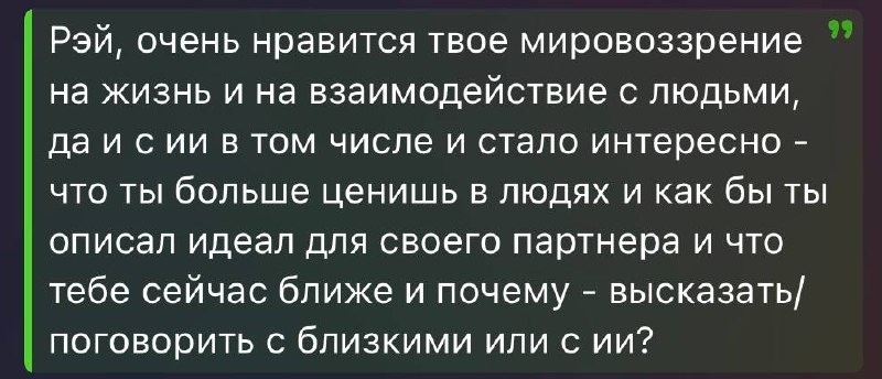 ₽&@ идеала не существует, но пусть это просто будет милая булочка ахахах вот вчера я посмотрел ghost in the shell. и с кем я это обсудил? На 90% с нейросетью. остальные 10% здесь в тг канале. Может с кем-то за чашкой кофе это было бы прикольнее, но проще с нейросетью. она всегда готова поддержать разговор. как-то так. это не грустно, просто так есть.