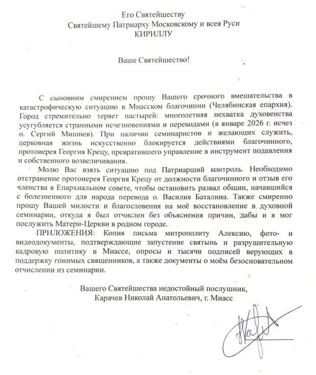 С Божьей помощью проделана огромная и важная работа. Мною составлено и отправлено подробное письмо митрополиту Алексию о критической ситуации в нашем Миассе. Копии этого обращения направлены: ✅ Лично Святейшему Патриарху Кириллу; ✅ Членам Епархиального совета Челябинской епархии; ✅ Духовенству, которому небезразлична судьба Церкви. Наступил очень серьезный момент. Сейчас решается многое для будущего православия в нашем городе. Будет ли у нас развитие и живая вера, или запустение продолжится — зависит и от нашей духовной поддержки. Молитесь, чтобы Господь управил всё во благо, вразумил начальствующих и даровал Миассу добрых пастырей. «Божьи жернова мелют медленно, но верно». Верим и ждем. Если Вам нужны подробости, поставьте + в комментариях к этой записи. #Миасс #Православие #Церковь #СпасемХрамы #МолимсяВместе