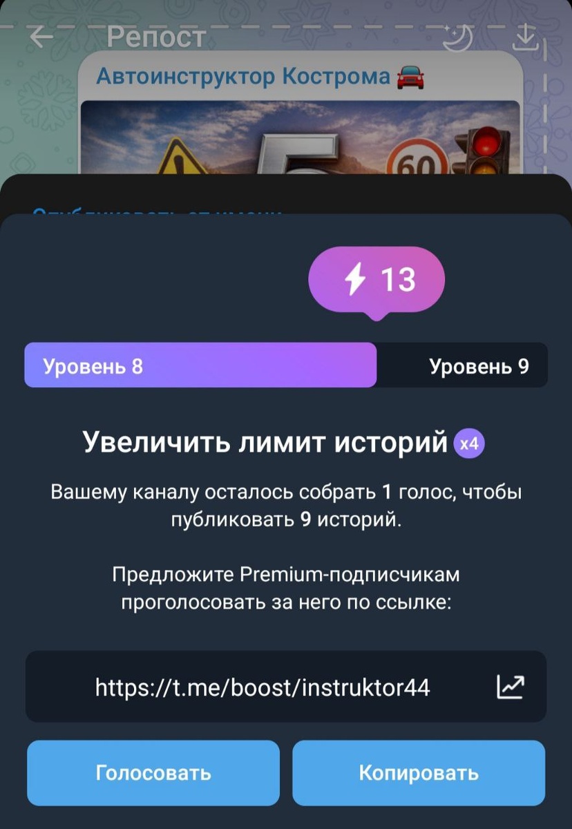 ! Ваша поддержка помогает мне становиться лучше и делиться с вами полезными материалами. Сейчас моему каналу остался всего 1 голос до увеличения лимита историй до 9 в сутки. Это позволит чаще публиковать для вас актуальные советы по вождению, разборы ситуаций на дорогах и другие полезные материалы. Если у вас есть подписка Telegram Premium, буду очень благодарен за ваш голос по ссылке ниже. Каждый ваш голос — это шаг к более насыщенному и полезному каналу! Проголосовать можно здесь: https://t.me/boost/instruktor44 Заранее спасибо за ваше участие и доверие! Ваша обратная связь и поддержка очень важны для развития канала 🤗.