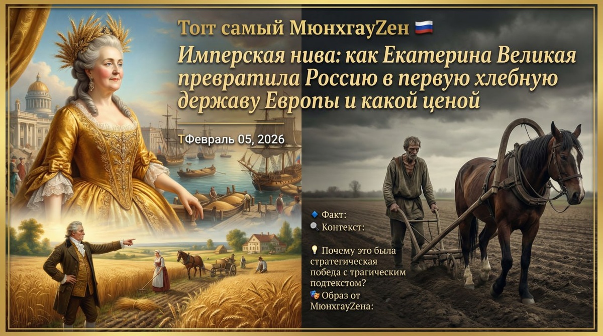 » Цикл: «Хлеб и воля: Как Русское земледелие от сохи до агрохолдингов ковало мощь Державы» 📅 Имперская нива: как Екатерина Великая превратила Россию в первую хлебную державу Европы и какой ценой - Часть 1️⃣/2 🔹 Факт: XVIII век, особенно эпоха Екатерины II, стал поворотным моментом, когда Hусское сельское хозяйство из системы выживания превратилось в мощнейший инструмент государственной политики и источник имперского богатства. Благодаря реформам, освоению Новороссии и жёсткой экспортной ориентации Россия к концу века стала крупнейшим в мире экспортёром зерна, а русский хлеб начал диктовать цены на европейских рынках. Этот аграрный прорыв финансировал армию, флот и великую культуру, но лёг он на плечи крестьянства невиданной тяжестью, закрепив крепостное право как основу экономики. 🔍 Контекст: — Реформы и воля дворянства: Манифест о вольности дворянства 1762 года, подписанный Петром III и подтверждённый Екатериной, стал ключевым актом. Дворяне, освобождённые от обязательной службы