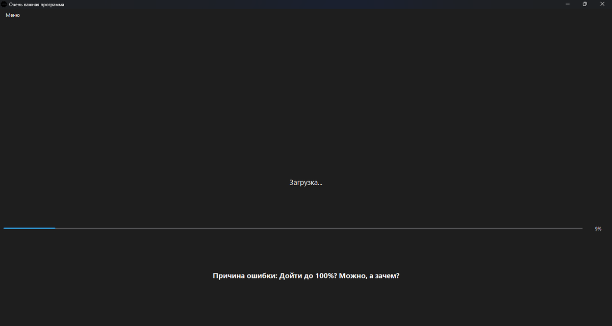 Очень важная и необходимая программа, которая за вас будет ничего не делать, пока вы можете ей помогать или поделать ничего сами. Программа создалась от нечего делать, от скуки и просто потому, что программе было скучно. Более 300 вариантов забавных "ошибок" Программа может дойти до 100%, но может и никогда не дойти до этого А может и просто реально зависнуть или вылететь! Так же можно отображать или не отображать причину "ошибки" Поэтому программа озадачила разработчика разработкой самой себя. Разработчику ничего не оставалось кроме как потратить это время и создать её! Это было жестокое обращение с извилинами, которых у программы нет. В общем, просто шуточная программа, когда вам нечего делать =) Если программа дойдёт до 100% будет фейрверк! Если хотите ничего не делать и посмотреть как программа ничего не делает, качать здесь: ссылка на архив Если вам нечего делать и вдруг захотелось задонатить разрабу, можете это сделать - программа не запрещает.