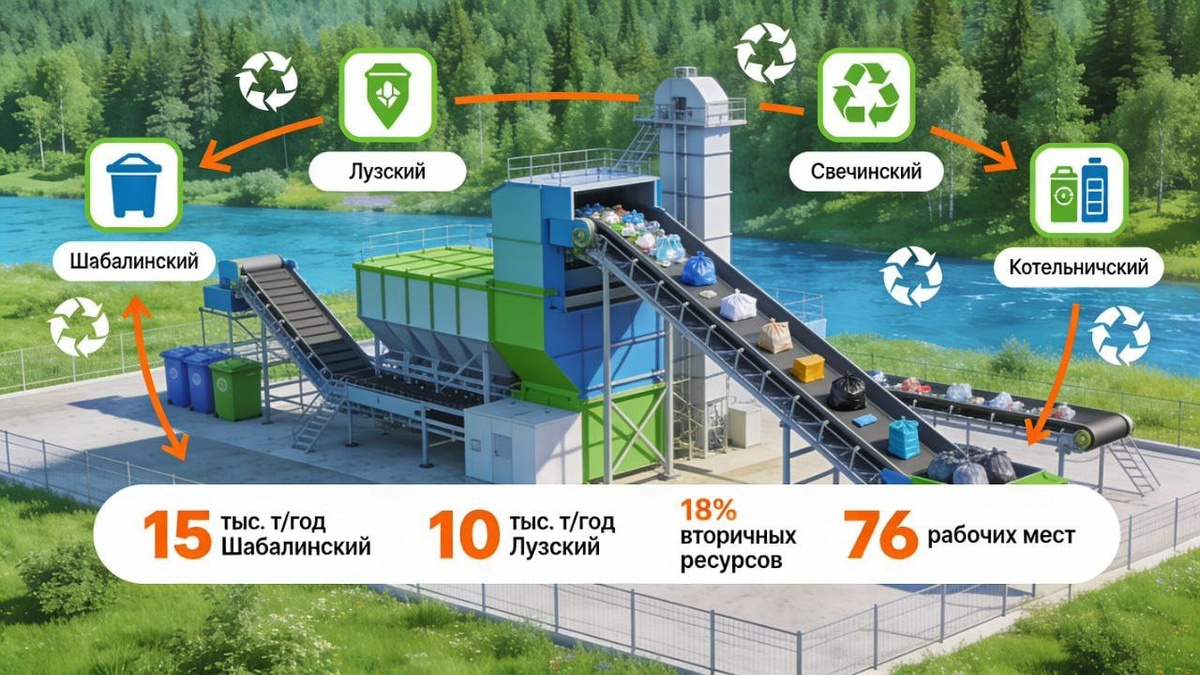 Концессионные соглашения о строительстве и эксплуатации мусоросортировочных станций в Шабалинском районе и Лузском муниципальном округе подписаны. Строительство начнётся в IV квартале 2026 года, а выйти на полную мощность станции должны к началу 2028 года.