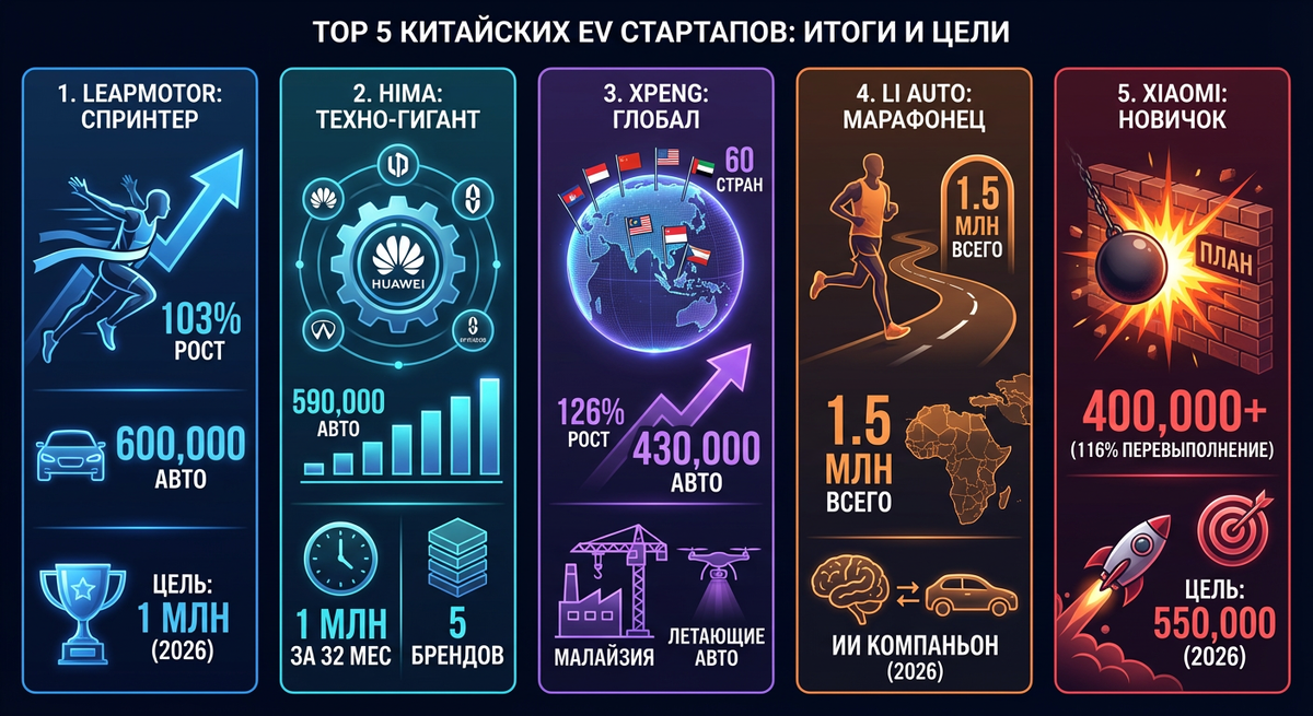 Забудьте все, что вы знали о скучных отчетах о продажах. 2025 год в китайской автомобильной индустрии был не просто годом — это был сезон настоящей охоты, где на кону стояло будущее. Когда пыль улеглась, и зажглись табло, стало ясно: на наших глазах развернулась эпическая сага о скорости, технологиях и дерзких амбициях. Пять компаний не просто продавали машины — они боролись за корону. На вершине Олимпа, к удивлению многих, оказался Leapmotor. Эта компания не просто ехала — она летела, увеличив поставки на головокружительные 103% и передав клиентам почти 600 000 автомобилей! Они не только отпраздновали выпуск своего миллионного авто, но и, что почти немыслимо для стартапа, три квартала подряд зарабатывали деньги. С новыми моделями наготове и флагом, уже водруженным в Гонконге, Leapmotor бросает вызов судьбе, целясь в миллион машин в 2026 году. На втором месте, дыша в спину лидеру, расположился альянс HIMA, за которым стоит технологический колосс Huawei. Они нарастили поставки на 32%, о
