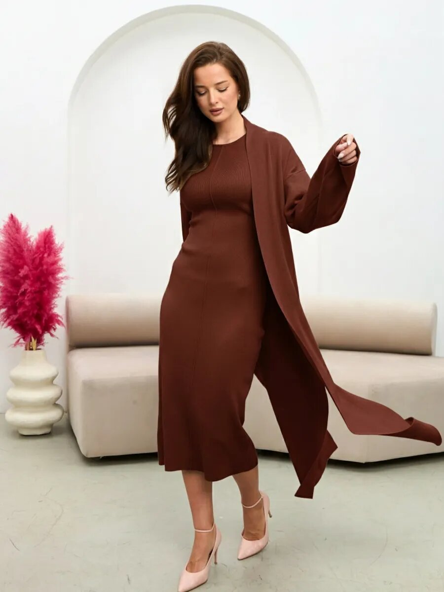 Этот комплект — must-have для тех, кто устал думать, что надеть. Готовый лук, который выглядит как продуманный дорогой ансамбль. Трикотажное платье хорошо садится по фигуре, а длинный кардиган сверху создает модный многослойный образ.