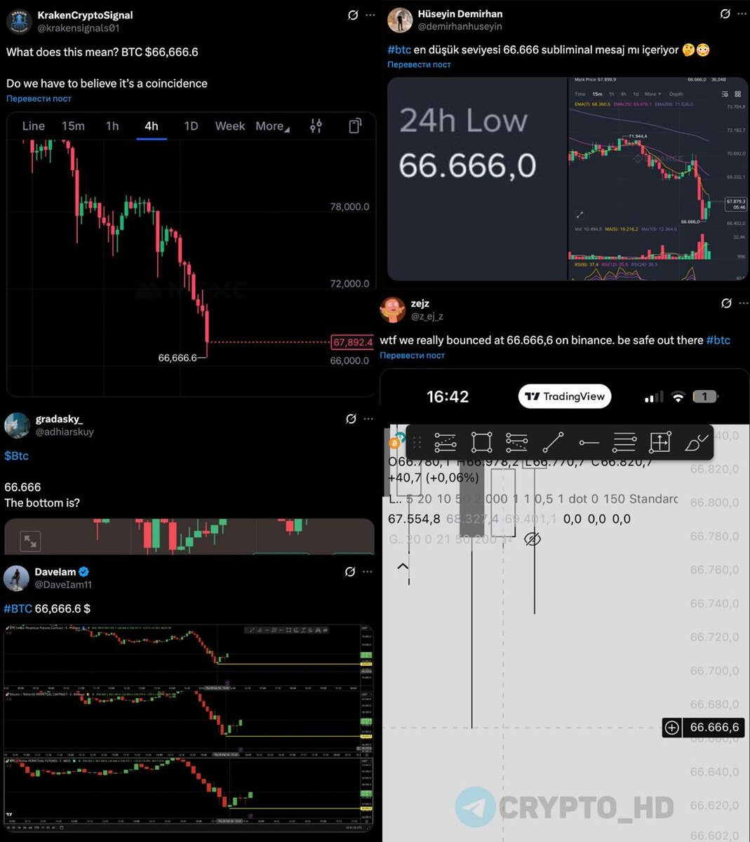 👹 У конспирологов в Twitter появилась работа - Биткоин по $66,666 на Binance. Скоро в соцсетях появится классический набор: «символизм», «знак», «намеки от китов», скрины с бирж, треды с нумерологией и подборка «совпадений», плюс отсылки к сатане и «библейским посланиям». Crypto Headlines