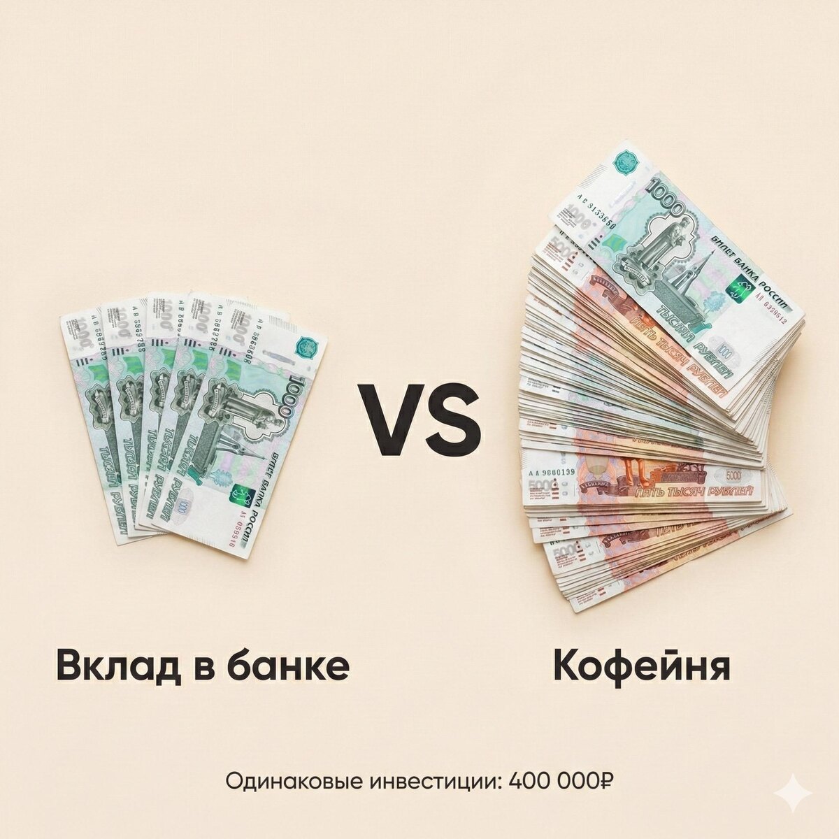 Куда их вложить? Если вы хотите, чтобы эти деньги работали на вас, а не просто лежали под матрасом и при этом вы не сторонник кладовок или криптопирамид, то вот два реальных варианта. Вариант 1: Положить на вклад в банке. Вариант 2: Купить кофейню. Сейчас разложим на пальцах, сколько реально заработаете. ВАРИАНТ 1: Вклад в банке Берём февраль 2026, топовые банки: Сбербанк: до 16% годовых ВТБ: до 15% годовых Газпромбанк: до 16,2% годовых Окей, положили 400 тысяч под 16% в Сбере. Что получаем: 400 000₽ × 16% = 64 000₽ в год Или 5 333 рубля в месяц. То есть пять с копейками тысяч. На эти деньги можно... ну, пару раз в кафе сходить. Или бензин залить, если машина есть. Плюсы: Надёжно, застраховано, вообще ничего делать не надо. Минусы: Инфляция сейчас 8-9%, так что реально ваши деньги растут процентов на 7. Круто, да? 😏 А ещё их год нельзя трогать, они заморожены. ВАРИАНТ 2: Кофейня (реальный бизнес) ☕ Берём средний пакет за 400 тысяч (не минимум, не максимум, золотая середина)