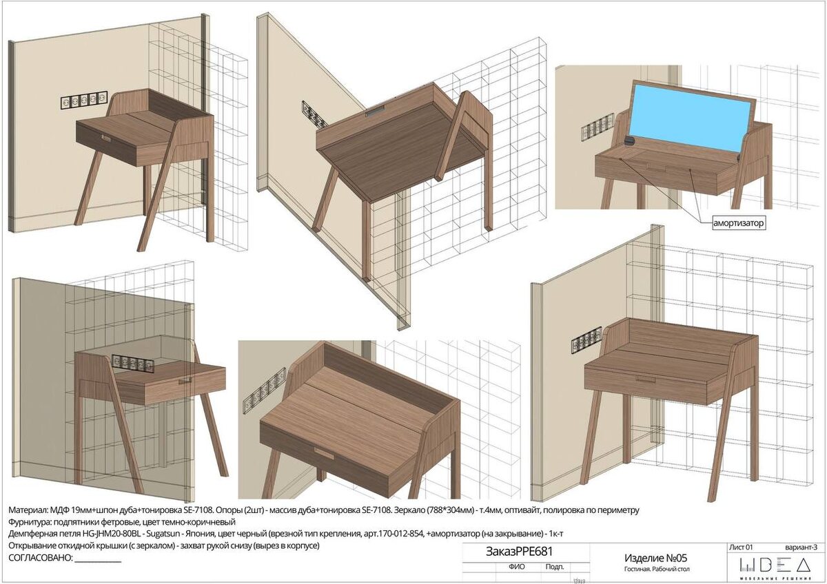 ». Сегодня разбираем его изнанку [чертежи] проекта. #чертежи_ШВЕД Корпус выполнен из МДФ со шпоном. Все видимые торцы заданы с единым направлением текстуры — это важно, чтобы изделие в реализации не «распадалось» визуально. В чертежах отдельно зафиксированы толщины деталей и узлы примыкания, чтобы стол выглядел легким, но при этом оставался функциональным в конструкции. Встроенный ящик на скрытых направляющих. Его положение рассчитано так, чтобы он не конфликтовал с посадкой стула и не выходил за габарит столешницы. Это мелочь, которая часто всплывает уже на объекте, поэтому мы всегда фиксируем такие моменты заранее.