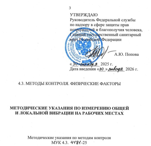 " https://www.rospotrebnadzor.ru/documents/details.php?ELEMENT_ID=31522 Применяется с 30.01.2026 взамен Методически[ указания\q по проведению измерений и гигиенической оценки производственных вибраций от 10.07.1985 N 3911-85 https://www.rospotrebnadzor.ru/upload/iblock/9b3/z1bx8qgu9udne5sdzk0a7cetmewgtcdi/MUK-4.3.4181_25.pdf