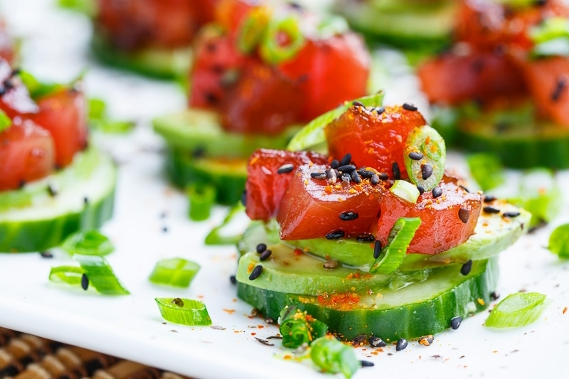 • 1 огурец ■ Филе тунца порубите мелкими кубиками, огурец нарежьте кружочками, а авокадо слайсами. Кунжутое масло подогрейте.