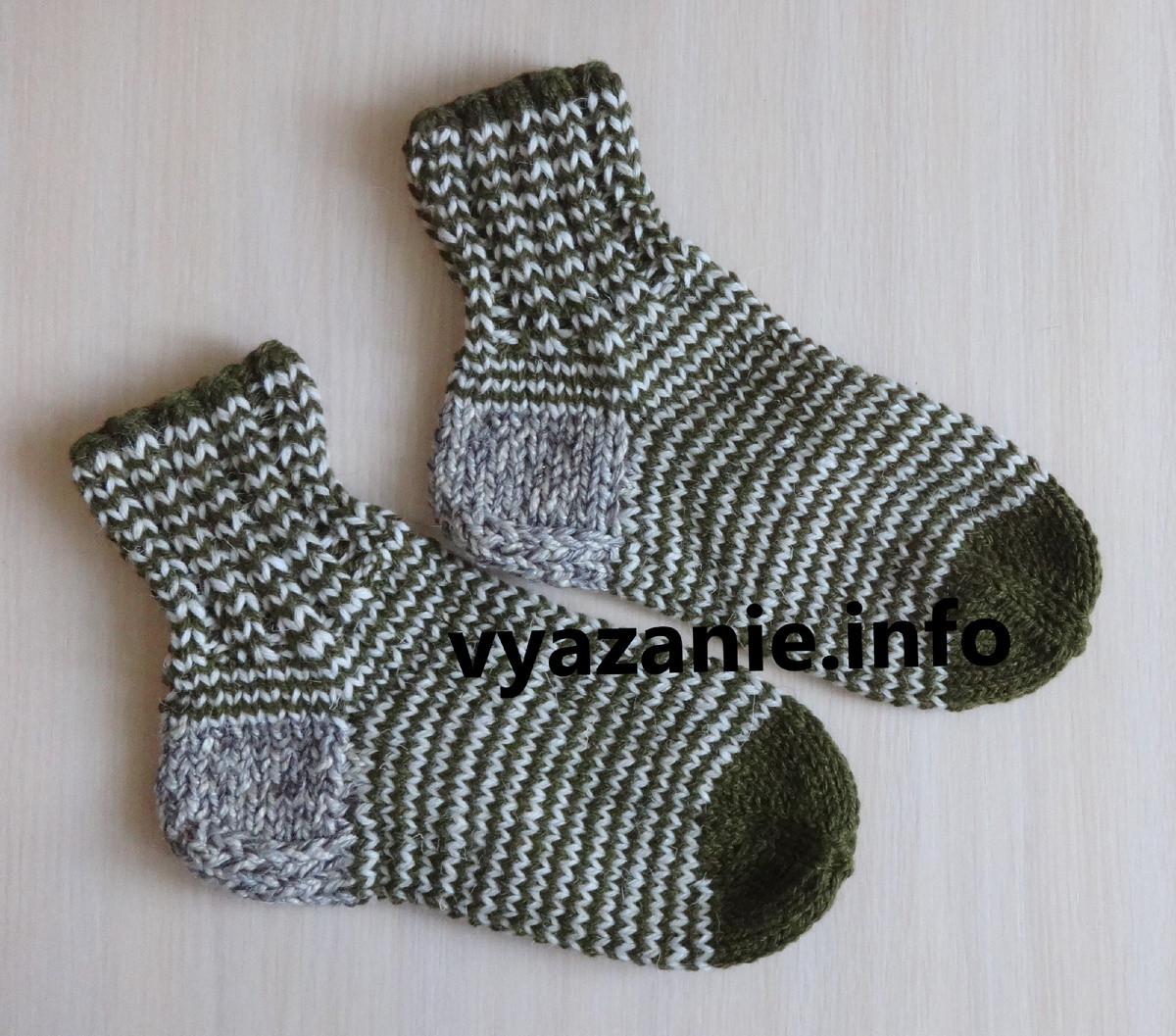 Наконец-то услышала от мужа, что носки классные! Всегда вязала ему из натуральной шерсти, мериносовой или ангорки. Тёплые, мягкие, красивые. А ему всё по-толще надо и пятку крепкую. Видимо, такие ему раньше бабушка вязала. В этот раз взяла толстую рассказовскую полушерсть в таблетке и были остатки от следков (без этикетки), думаю, что акрил. По толщине одинаковые. Быстро-быстро связала на спицах №4. Получилось то, что надо! Как же я радовалась! Угодила! Сразу одел и носит с удовольствием! Сфотографировать на его ногах даже не успела. Почему носки полосатые? Если честно, то однотонные мужские носки вязать мне скучно и трудно. Так долго вяжутся! Методом Хеликс вязать гораздо интереснее и получаются быстрее. Согласны со мной? На 2 сложенные вместе спицы пряжей цвета хаки крестообразным способом набираю 40 петель + 1, чтобы аккуратно сомкнуть в круг. Я вяжу носочными спицами №4. Петли на трёх спицах, а четвёртой вяжу. На первой и третьей спицах по 12 петель, на второй спице 16 петель. Дл