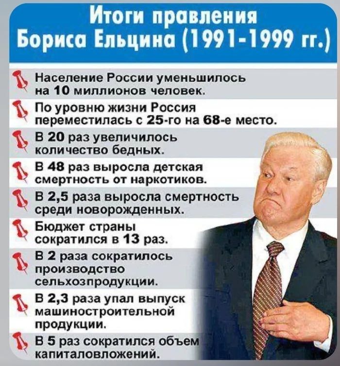 Люблю я эту историческую тему. Зачем это бизнесменам? Чтобы не отрывались от прошлого и помнили, что ещё недавно было. Ельцин едва не отдал Курильские острова Японии и только стихийный массовый народный протест остановил эту катастрофу. Он помог появиться независимой республике Ичкерия, по сути это решение Ельцина стало причиной новой чеченской компании 1999 года — военным посягательством на территорию Дагестана. Именно Ельцин превратил русский народ в разъединенную нацию — за порогом границ бывшего СССР без помощи и защиты осталось 25 миллионов русских. Темпы вымирания населения России составляли 1 миллион человек в год. По внутреннему валовому продукту на душу населения Россия переместилась на 95 место в мире. Размер зарплаты отставал от роста цен в 10 раз. Были уничтожены все банковские сбережения граждан, все социальные и общественные фонды, детские сады, пионерские лагеря, санатории… Привилегии правящей номенклатуры стали невероятно огромными, доходы измерялись миллионными