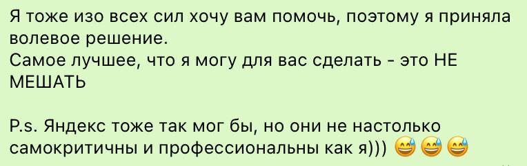 :)) И ведь действительно - если вы собрали команду, то ваша задача - самоустраниться, пока не потребуется действительно ваша помощь. Пока они не столкнутся с задачей, которую они сами не смогут решить. 🤩А вот понять, какую задачу они смогут или не смогут решить - это ваша главная компетенция. Если ваши сотрудники не могут решить, какую воду заказать в офис, то это вы некомпетентны как руководитель, а не офис-менеджер. Не мешать заказывать воду, не мешать делать хорошо клиенту, не мешать ошибаться и исправлять ошибки. Не мешать - принимать самостоятельные решения и расти. Часто так бывает, что мы своими советами и наставлениями забираем у людей воздух - мы мешаем им работать. Рост происходит только через принятие решений. Если вы принимаете решения за своих сотрудников, то растете вы, а они - нет. Не растут люди - не растет бизнес. Я могу принимать все решения, всем говорить, что делать и как. Я даже могу сама находить решения, если у меня их пока нет. Но итогом будут замкнуты