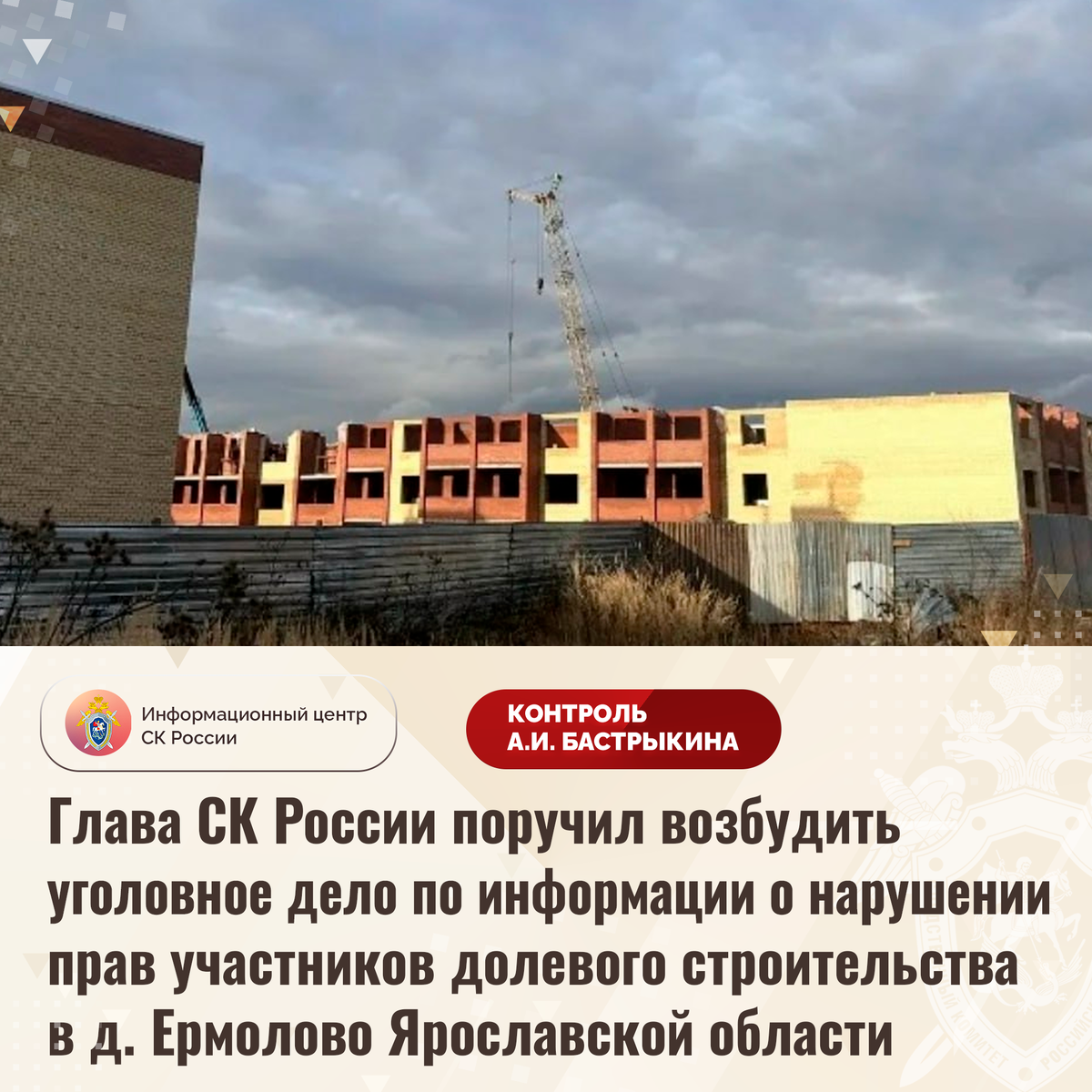 Глава СК России поручил возбудить уголовное дело по информации о нарушении прав участников долевого строительства в д. Ермолово Ярославской области В социальной сети размещено обращение к Председателю СК России А.И. Бастрыкину по вопросу нарушения прав участников долевого строительства двух корпусов ЖК «Зелёный Бор» в деревне Ермолово Ярославской области. Ранее более 80 семей заключили с организацией-застройщиком договоры на приобретение квартир в строящихся домах, оплатив их, в том числе за счет средств ипотечного кредитования. Ввод строений в эксплуатацию был запланирован на апрель 2025 года, однако до настоящего времени работы не завершены, граждане вынуждены арендовать жилье за свой счет. Обращения в компетентные органы результатов не принесли. В СУ СК России по Ярославской области проводится процессуальная проверка. Председатель Следственного комитета Российской Федерации Александр Иванович Бастрыкин дал указание руководителю СУ СК России по Ярославской области Александру Алексан