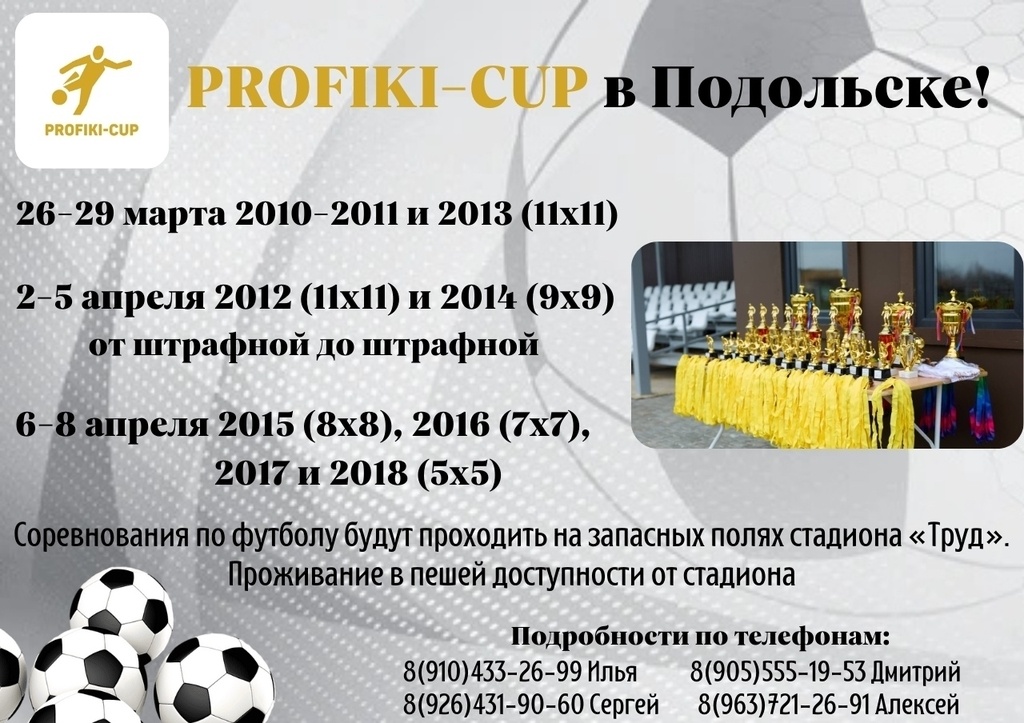 Подольск (Московская область). ⁃ Награждение каждого участника соревнований ⁃ Награда MVP матча ⁃ Топовая статистика каждого игрока турнира в AllBalls.pro ⁃ Прямые трансляции матчей с комментатором ⁃ Качественное судейство (бригада из 3 арбитров на каждой игре) ⁃ игры проходят на стадионе Труд (резервные поля) в самом городе, который славится своими архитектурными достопримечательностями и находится рядом с Москвой (36 км) и аэропортом Домодедово (36 км) ⁃ доступная цена за полный пакет, хороший бонус для вашей команды! С уважением, организаторы турнира PROFIKI CUP! Для получения подробной информации: +7-910-433-26-99 Илья +7-905-555-19-53 Дмитрий +7-963-721-26-91 Алексей +7-926-431-90-60 Сергей --- #ФутбольныйТурнирМарт2026 #ФутбольныйТурнирАпрель2026 #ФутбольныйТурнирМосковскаяОбласть2026 #ФутбольныйТурнирПодольск2026 #ФутбольныйТурнирМосковскаяОбласть2010гр #ФутбольныйТурнирМосковскаяОбласть2011гр #ФутбольныйТурнирМосковскаяОбласть2012гр #ФутбольныйТурнирМосковскаяОбласть2013гр #Фу