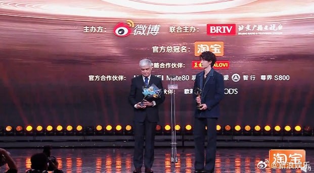 "! 😎 Ибо получил премию с Викрамом Чанной - вице-президентом Discovery по Китаю и Южной Корее 😊 #МероприятияВанИбо #WangYibo #ВанИбо #WeiboNight2025