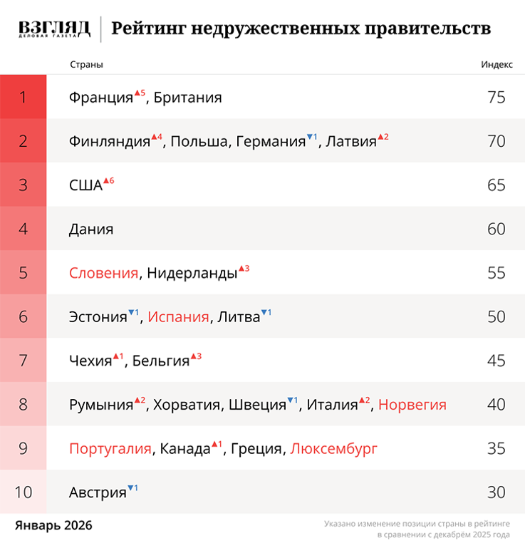 Показатели враждебности европейских государств к России в январе заметно снизились – об этом свидетельствуют данные ежемесячного «Рейтинга недружественных правительств» газеты ВЗГЛЯД. Однако эксперты считают, что подобные изменения носят ситуативный характер и связаны с отвлечением Брюсселя на конфронтацию с Вашингтоном из-за контроля над Гренландией. Согласно «Рейтингу недружественных правительств» за январь (.pdf), страны ЕС несколько снизили агрессивность в отношении России – среднее значение индекса враждебности упало на 15,2 пункта. Эксперты связывают это с обострившимся противостоянием Брюсселя и Вашингтона из-за контроля над Гренландией, что «отвлекло» Старый Свет от конфронтации с Москвой. Первое место в рейтинге заняли Британия и Франция (по 75 баллов). Их высокие позиции объясняются продолжающейся военной поддержкой Украины – обе страны предоставляют Киеву значительную финансовую помощь и поставляют вооружения. Примечательно, что Германия, лидировавшая два месяца подряд, опус