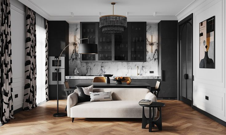 Обеденная зона (если она между кухней и гостиной): подвесной светильник или группа светильников над столом. Это создаёт фокусную точку и выделяет зону.