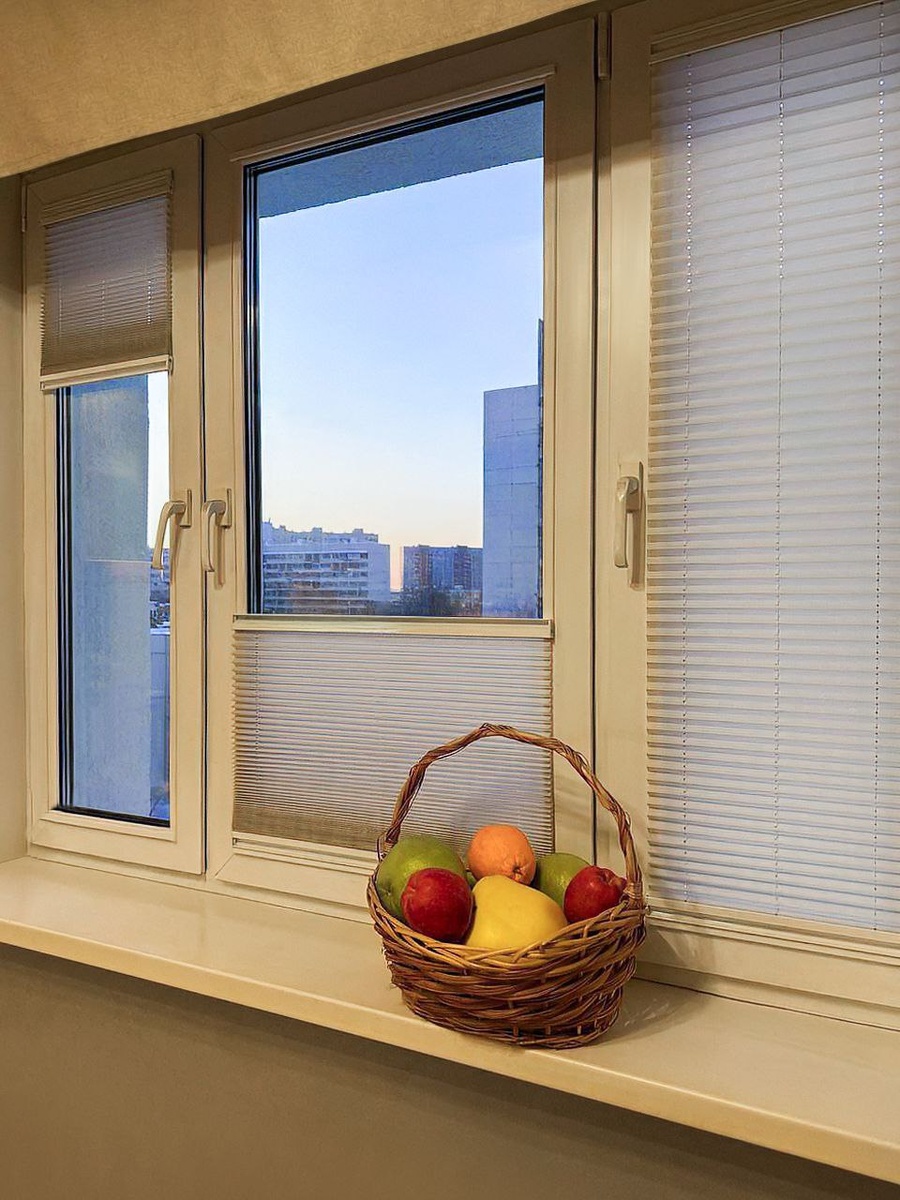 Это самые компактные изделия, которые монтируются на раму, оставляя свободным подоконник и не препятствуют открыванию окон настежь. Плавное управление за ручки внизу и наверху даёт возможность разных сценариев открывания.