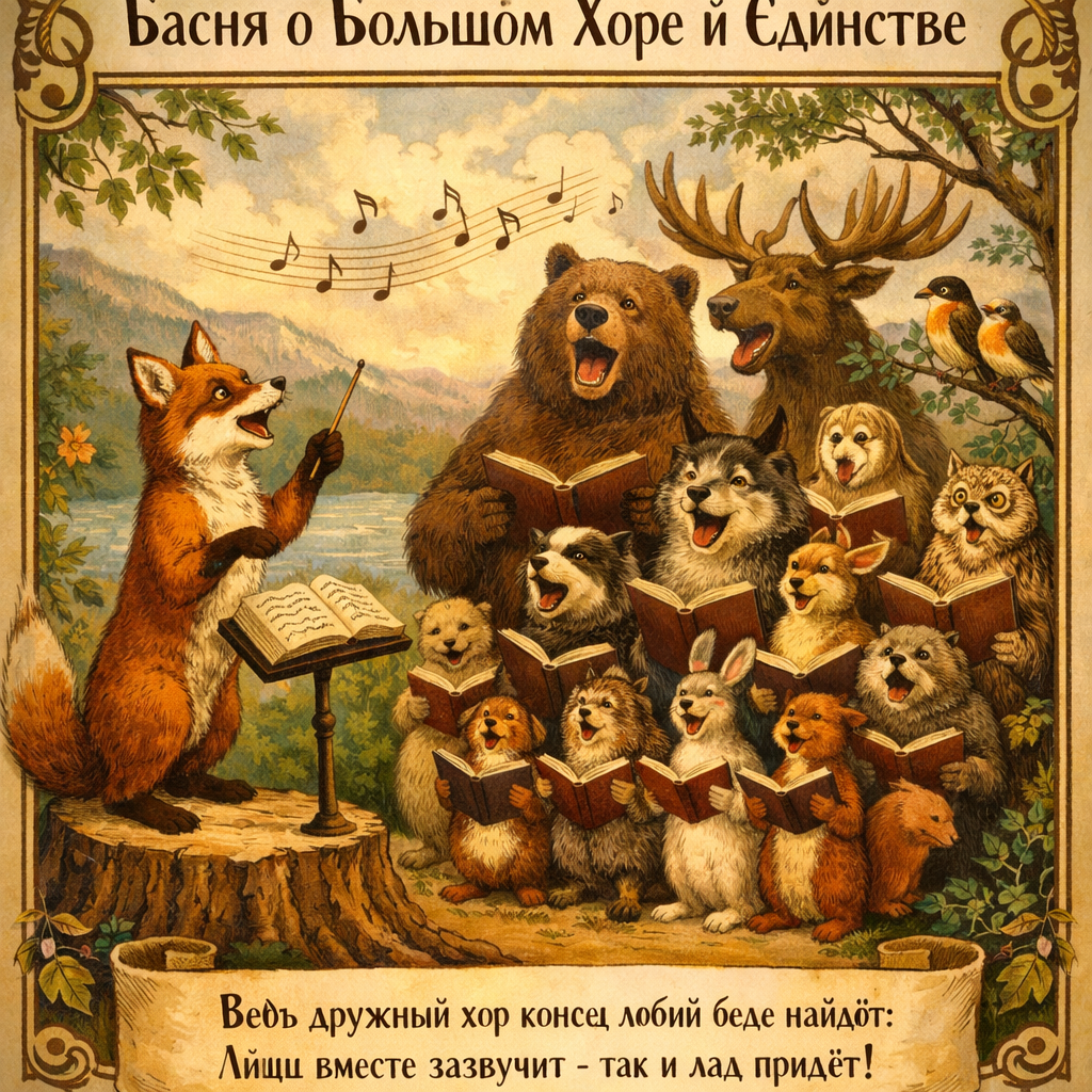 В одном густом лесу, где вековые дубы переплетались ветвями с молодыми берёзами, случилось великое событие. 🪵 Лесной Совет объявил: «Да будет День Единства! Соберёмся все вместе и провозгласим наше братство от сосны до малинового куста!» 🌲 Собрание назначили на главной поляне — там, где когда-то волки и зайцы по очереди пили из одного ручья, не встречаясь взглядами. 🐺🐰 И вот настал день торжества. Первым пришёл Старый Дуб — махина с могучими корнями, уходящими вглубь на целую сажень. 🌳 Он важно уселся в центре и объявил: «Я — основа леса! Без меня не было бы ни тени, ни почвы для ваших корешков. Слава единству под моим сенью!» 🍃 Следом явился Куст Барбариса, увешанный колючками. «А я защищаю периметр! — прошипел он. — Только мои ягоды годятся для варенья. Разве можно без меня?» 🫐 Рядышком притулилась Стебель-Трава, робко промявшая: «А я... я держу почву. Вдруг кто не заметит моих заслуг?» 🌿 Солнце клонилось к закату, когда на поляну наконец прибыл Главный Организатор — Лиса п