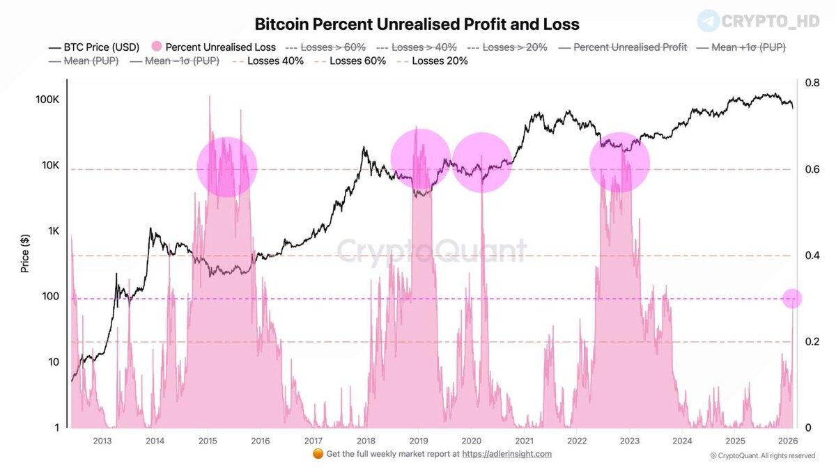 🧸 Аналитики CryptoQuant считают, что «настоящая» капитуляция в BTC еще не началась – судя по уровню нереализованных убытков.