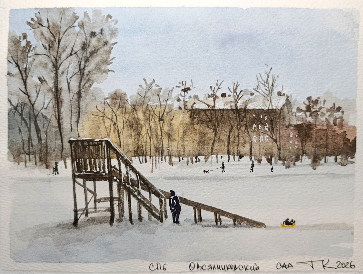 #кисти #краски #акварель #Городок #прогулки #зарисовки, "Дедушка, пойдём на горку