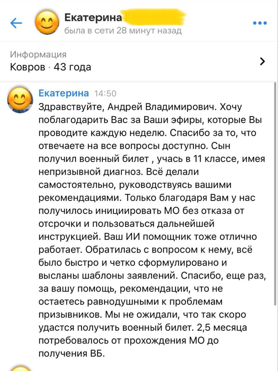 Рад быть полезным. Друзья, пользуйтесь ИИ-Помощником [он составит для вас любой шаблон документа, проанализирует вашу ситуацию по здоровью, поможет определить категорию годности, составит пошаговый план по подготовке к призыву, — в общем, что угодно. За 1 минуту! 24/7], смотрите эфиры, задавайте вопросы. Всё получится! #АндрейПородзинский_клиенты