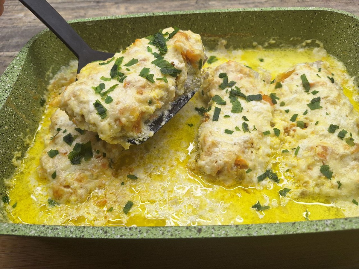 Этот рецепт хорош тем, что не требует редких продуктов и подходит даже тем, кто не слишком любит рыбу. Минтай получается сочным, мягким, без резкого запаха, а овощи и сырная шапочка делают блюдо насыщенным и гармоничным. Готовлю так и для семьи, и когда приходят гости — ещё ни разу не подвёл. Если минтай был заморожен, заранее размораживаю его в холодильнике или при комнатной температуре. Филе промываю, обсушиваю бумажным полотенцем и выкладываю в форму для запекания. Слегка солю и перчу — без фанатизма, потому что сыр позже добавит солёности. В отдельной миске смешиваю сметану, сливки, мелко нарезанный или пропущенный через пресс чеснок и натёртый на крупной тёрке сыр. Масса должна получиться густой, но пластичной. Лук нарезаю небольшими кубиками, морковь натираю на крупной тёрке. На сковороде разогреваю немного растительного масла и обжариваю сначала лук до прозрачности, затем добавляю морковь. Жарю 5–7 минут, пока овощи не станут мягкими и ароматными. Сильно зажаривать не нужно —