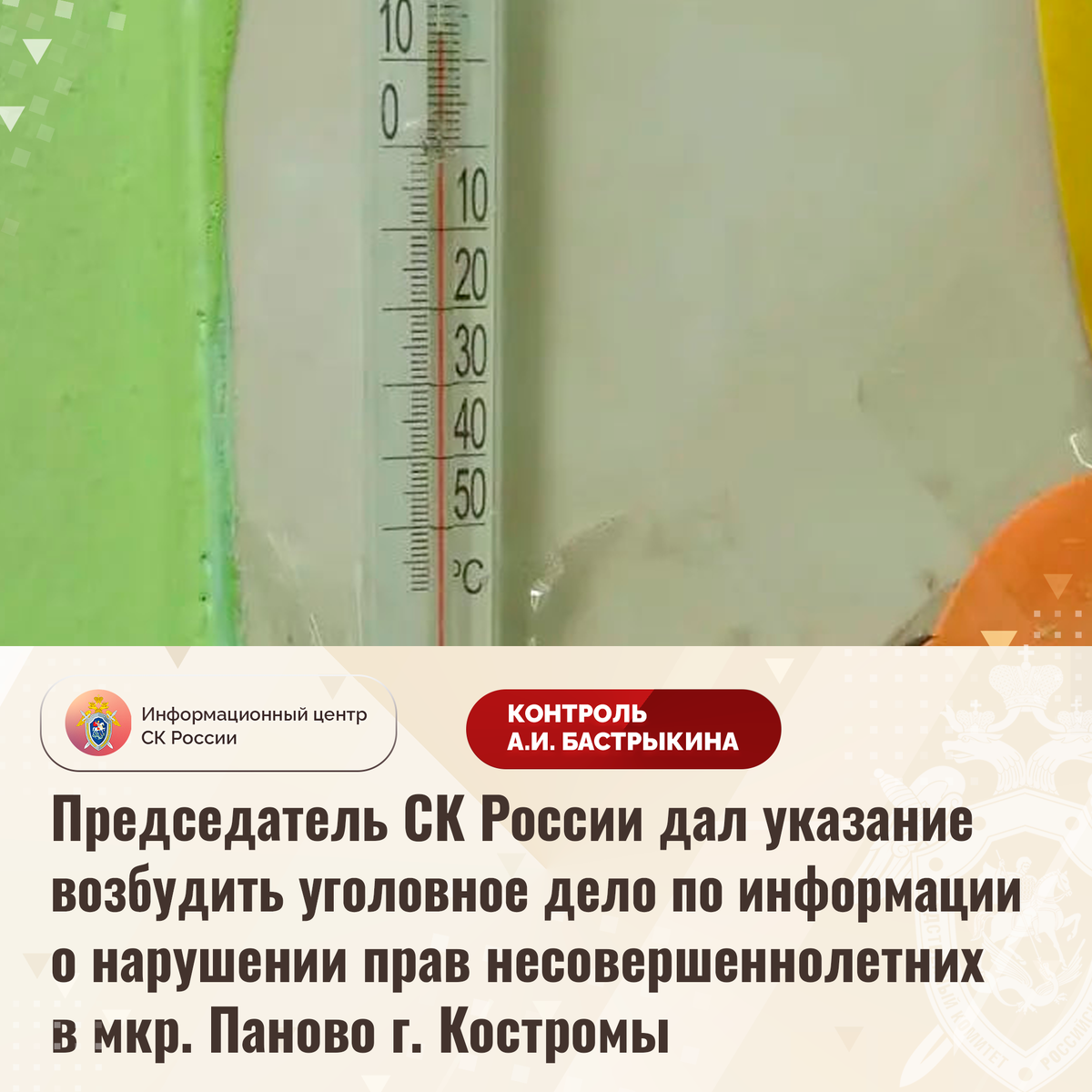 Председатель СК России дал указание возбудить уголовное дело по информации о нарушении прав несовершеннолетних в мкр. Паново г. Костромы В СМИ сообщается о нарушении прав учеников школы в микрорайоне Паново города Костромы. С декабря прошлого года в одном из кабинетов образовательного учреждения фиксируется низкая температура, дети замерзают и вынуждены находиться в небезопасных условиях. До настоящего времени проблема не разрешена. В СУ СК России по Костромской области по данному факту организована процессуальная проверка. Председатель Следственного комитета Российской Федерации Александр Иванович Бастрыкин дал указание руководителю СУ СК России по Костромской области Денису Николаевичу Левченко возбудить уголовное дело и представить доклад о ходе и результатах его расследования. Исполнение поручения поставлено на контроль в центральном аппарате ведомства. #СледственныйКомитет #СКРоссии #СК #ИЦСКР #ИнформационныйЦентр #АлександрБастрыкин #ПредседательСКР #КонтрольПредседателяСКР #Ком