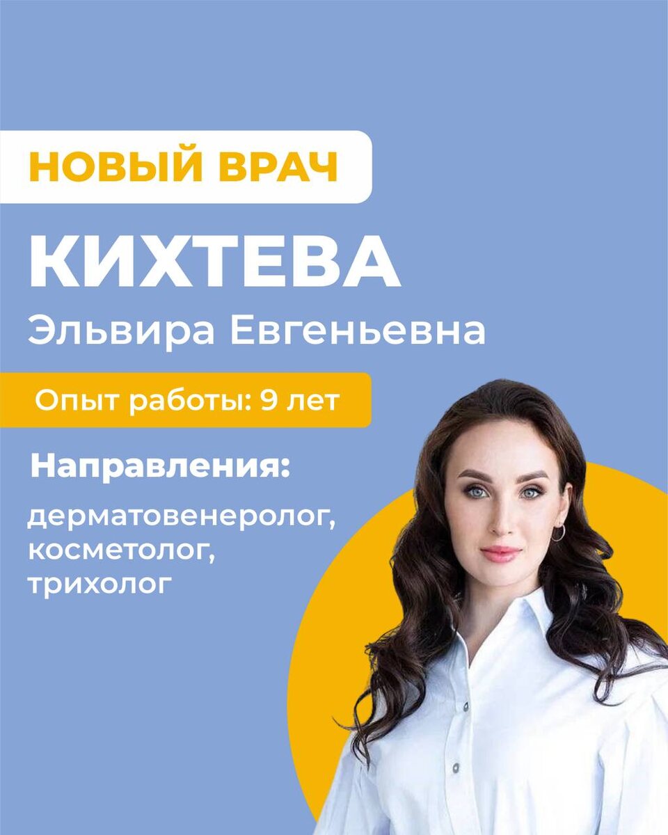» В нашей команде пополнение: врач-косметолог, трихолог, дерматовенеролог Кихтева Эльвира Евгеньевна. Стаж — 9 лет, ведёт приём пациентов с 14 лет. С чем можно обратиться: 🔴лечение дерматозов лица: акне, розацеа 🔴коррекция гиперпигментации 🔴возрастные изменения кожи 🔴лазерная эпиляция 🔴аппаратная косметология: ➡️ SMAS-лифтинг ➡️ микроигольчатый RF-лифтинг ➡️ фотоомоложение ➡️ УЗ-чистка лица 🔴инъекционные методики: ➡️ ботулинотерапия ➡️ контурная пластика ➡️ биоревитализация ➡️ мезотерапия ➡️ плазмотерапия ➡️ коллагенотерапия ➡️ лечение гипергидроза ➡️ инъекции ПДРН (омоложение) ➡️ лечение рубцов постакне, гипертрофических, келоидных 🤗 Записаться на консультацию или задать вопрос можно в боте по этой ссылке