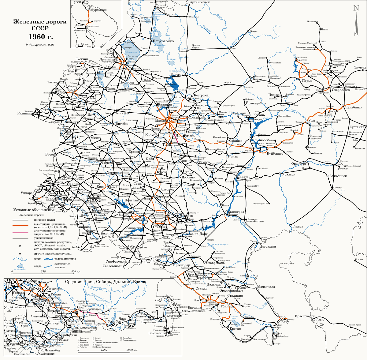 С учётом исправлений неточностей и ошибок, допущенных в прошлых частях (см. раздел «Работа над ошибками» в конце публикации), к концу 1960 года карта железных дорог СССР выглядела следующим образом.