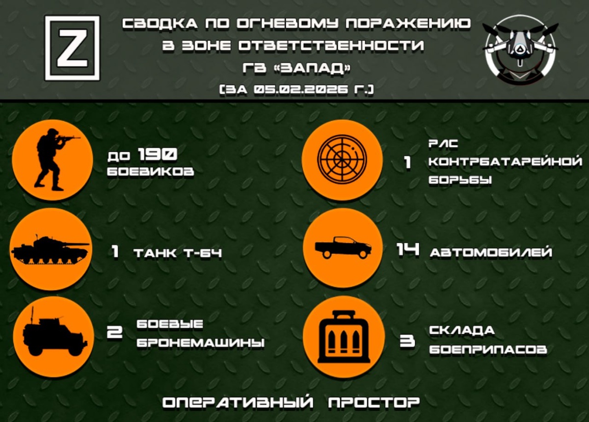 Сводка по огневому поражению в зоне ответственности ГВ «Запад» за 05.02.2026 г
