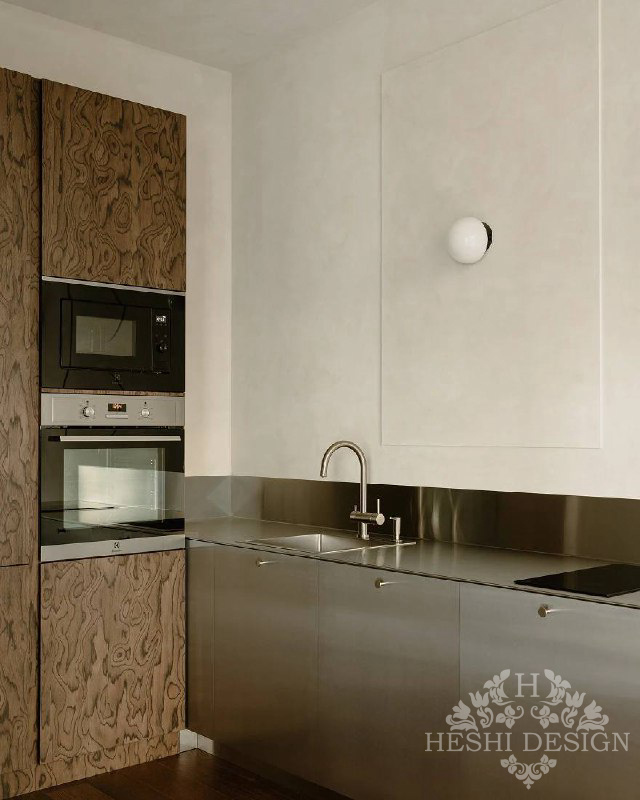 Тут мы переходим к самой приятной части — материалам. Пещера должна быть приятной на ощупь. Повсюду тактильные контрасты: шероховатая штукатурка рядом с бархатистой краской, холодный металл ручки на фоне теплого дубового паркета, тяжелый лен текстиля. Это важно. Когда вы касаетесь разных поверхностей, вы остаетесь «здесь и сейчас», это антистресс-практика. Мебель выбрана не дизайнерская, а простая, даже грубоватая, но идеально подогнанная по масштабу. Крупный диван в маленькой комнате — частая ошибка. Здесь каждый предмет по размеру, как хороший костюм. Даже на крохотной кухне нашлось место для полноценной столешницы, где можно не только готовить, но и работать за ноутбуком с видом на окно.