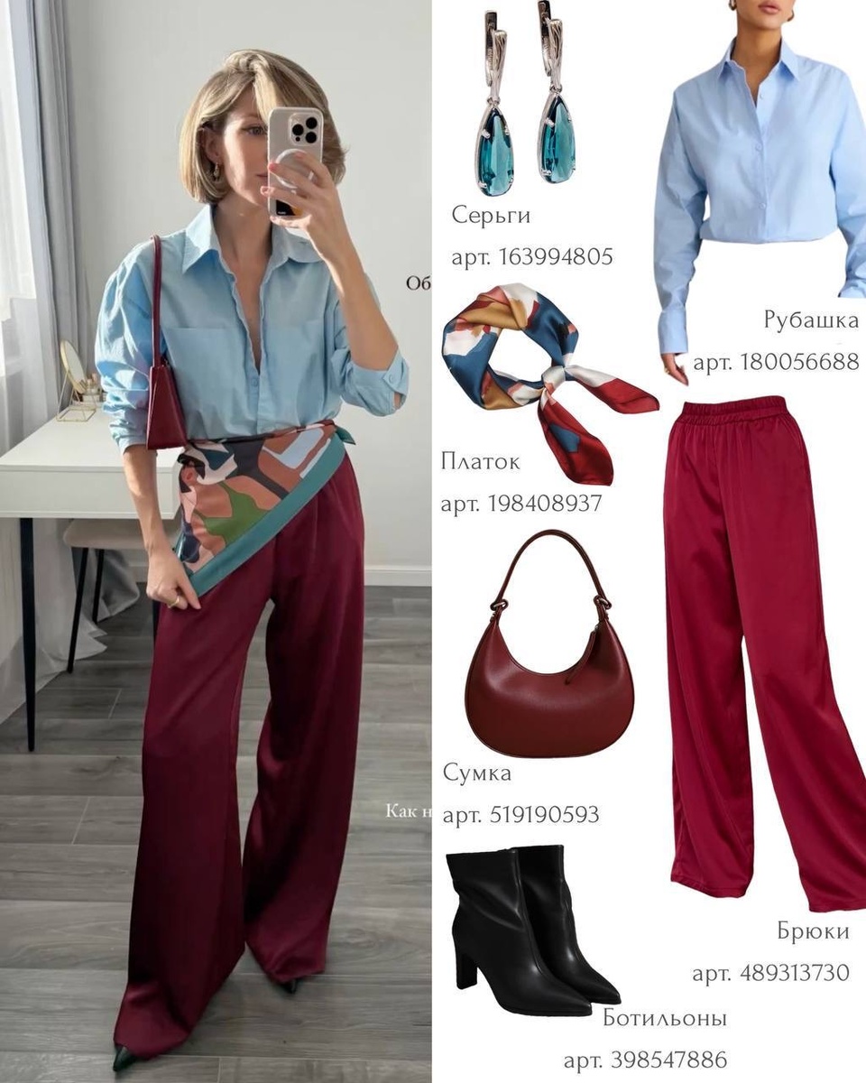 Сочетание светло-голубой рубашки и бордовых брюк выглядит сдержанно, но очень элегантно. Красный здесь не кричащий, а глубокий и благородный. Он добавляет образу статуса и визуального тепла. Платок с красными оттенками мягко поддерживает цветовую тему, а лаконичная сумка завершает ансамбль.