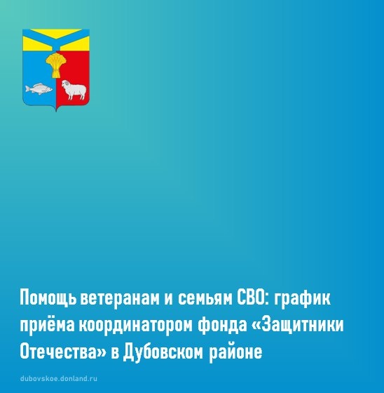 ! На территории района каждый второй и четвёртый вторник месяца будет проводить приём граждан социальный координатор Ростовского филиала государственного фонда «Защитники Отечества» по Зимовниковскому и Дубовскому районам Дердиященко Ирина Михайловна по вопросам оказания помощи участникам и ветеранам СВО, а также членам их семей. Приём будет осуществляться по адресу: с. Дубовское, площадь Павших Борцов, 1, Администрация Дубовского района, каб. № 5. #СВОихнебросаем #фондЗащитникиОтечества #графикприема #ДубовскийрайонРостовскаяобласть