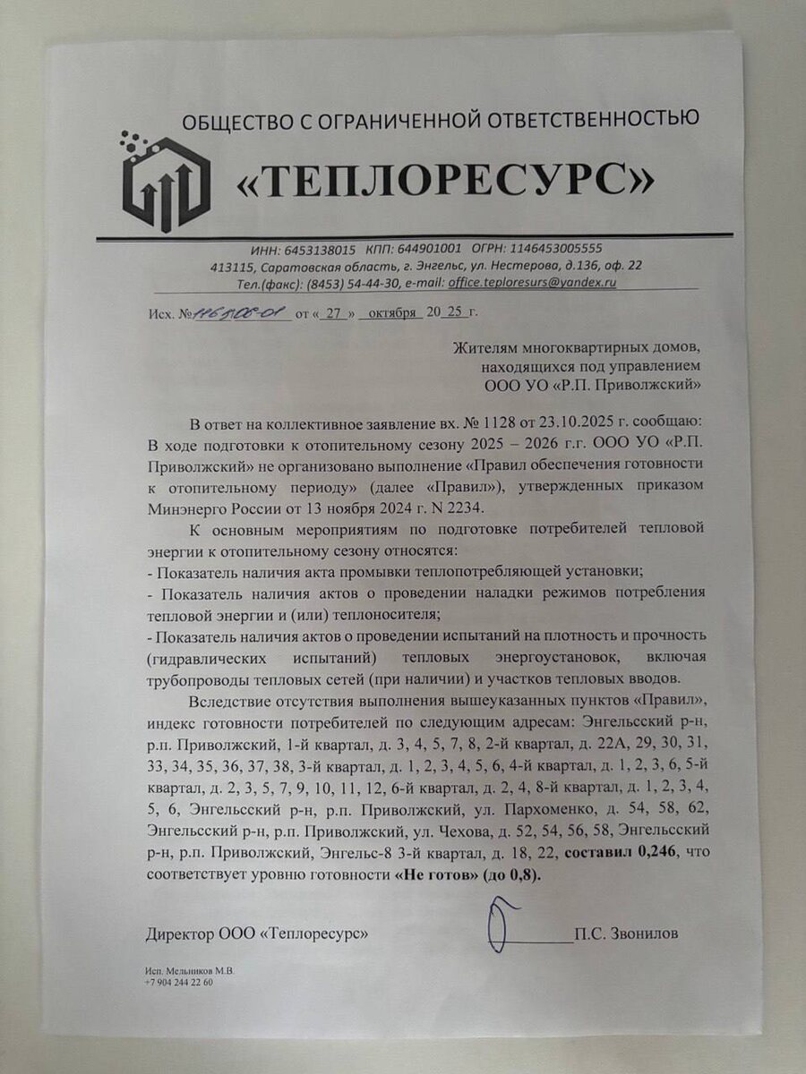 !!!!! Или что творится в УК Приволжский. Жителями многоквартирных домов, находящихся под управлением ООО УО «Р.П. ПРИВОЛЖСКИЙ» (ИНН 6449098176, директор Слободяников Геннадий Анатольевич) было написано коллективное заявление в ресурсоснабжающую организацию ООО «Теплоресурс» по вопросу подготовки домов к осенне-зимнему периоду 2025-2026гг. С ответом о проделанной работе ООО УО «Р.П. ПРИВОЛЖСКИЙ» в лице директора Слободяникова Геннадия Анатольевича, а точнее ее полным отсутствием Вы можете ознакомиться в приложенном фото. Исходя из чего, паспортов готовности к отопительному сезону с актом гидравлических испытаний, подписанных представителем ресурсоснабжающей организации нет ни на один дом, под управлением ООО УО «Р.П. ПРИВОЛЖСКИЙ». Теперь снова вопрос!!!! 🙋♀️ Как администрация подписала паспорт готовности поселка к отопительному сезону???? Отсюда и бездействие ГЖИ и администрации в адрес УК. ▫️ЭНГЕЛЬС ОНЛАЙН ▪️САРАТОВ ОНЛАЙН 🇷🇺 Мы в мессенджере MAX
