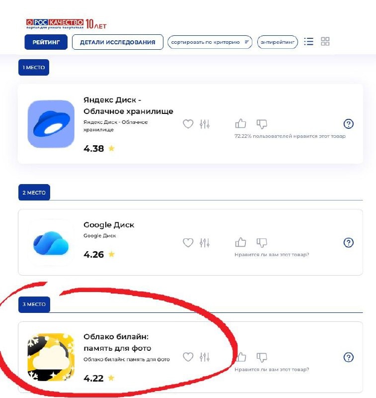Роскачество включило Облако Билайн в лидеры рейтинга безопасности среди облачных сервисов. Приложение занимает место в топ-3 для Android и топ-5 для iOS. Эксперты отметили: • Минимум слежки: отсутствуют трекеры активности, как и у Google Диска. В других сервисах обнаружено от 1 до 7 трекеров, в Terabox — 11. • Безопасность: данные передаются и хранятся в зашифрованном виде, инфраструктура расположена в РФ. • Функциональность: встроенный поиск дубликатов, офлайн-режим, удобная сортировка файлов. • Стабильность: высокая оценка синхронизации между устройствами и адаптации под планшеты. — «Только треть пользователей облачных сервисов разбирается в вопросах безопасности данных, 13% не задумываются об этом вовсе». Отсутствие скрытого сбора данных выделено как ключевое преимущество сервиса. https://dzen.ru/id/5c0e38ff46ef5c00aaa80527