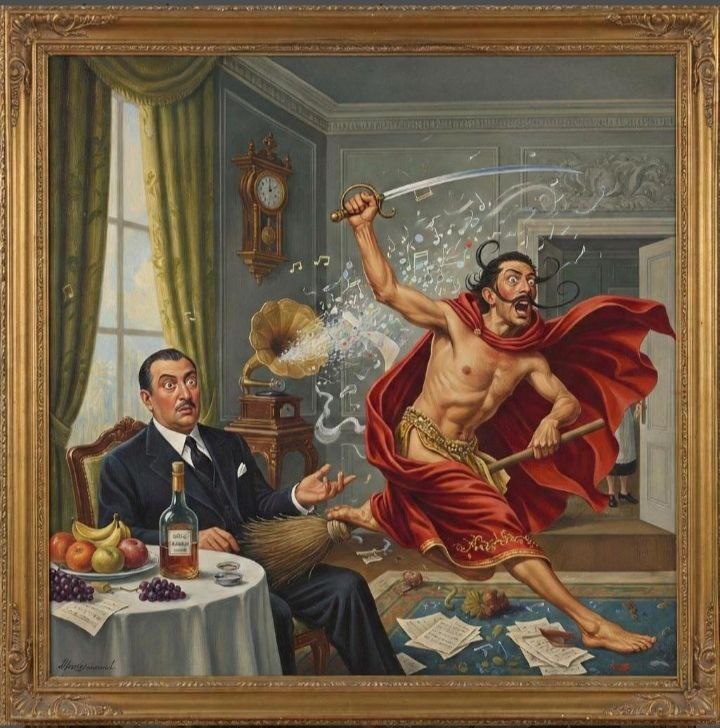 »). Хачатурян, как человек гостеприимный, пригласил гения к себе, накрыл стол с коньяком и фруктами и стал ждать. Прошел час. Второй. Хачатурян сидит в гостиной, Дали нет. Вдруг двери распахиваются... Под звуки включенного на полную громкость «Танца с саблями» в пустую залу влетает Дали. Он абсолютно голый (почти как Гюго, но с энтузиазмом), верхом на швабре, и размахивает настоящей саблей! Художник с дикими криками проскакал по диагонали через всю комнату, сделал круг почета вокруг онемевшего от шока композитора и так же стремительно исчез в дверях. На этом «встреча» закончилась. Дали уехал в аэропорт, оставив Хачатуряна наедине с коньяком и глубоким экзистенциальным вопросом: «Что это сейчас было?» Мораль: Как говорил сам Дали: «Единственное различие между мной и сумасшедшим в том, что я не сумасшедший». Ну, мы-то с вами понимаем, что грань тут тоньше, чем лезвие его сабли.
