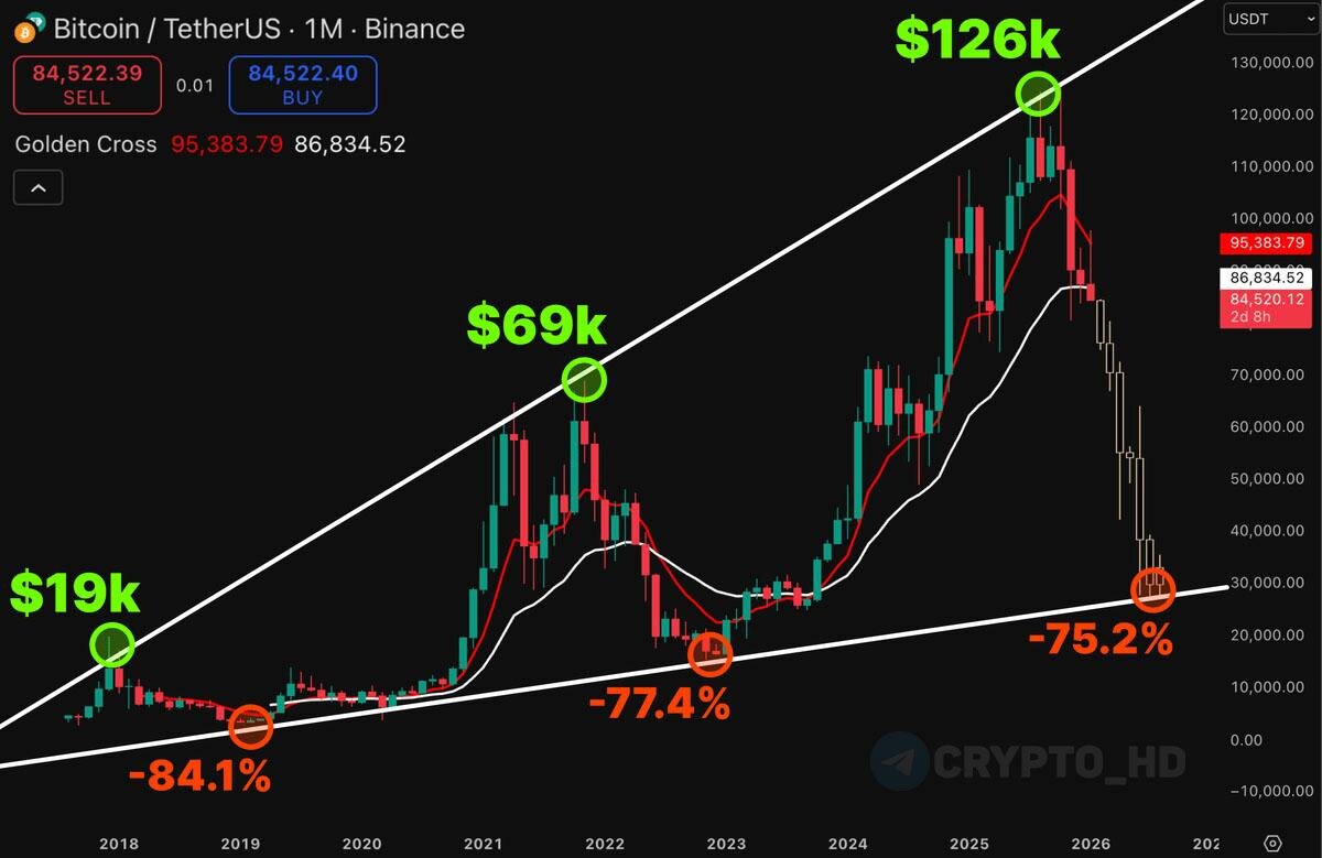 🧛 Фрактал 2018, 2022 гг. и сейчас – в Twitter активно форсят графики с потенциальным откатом BTC до $30,000.