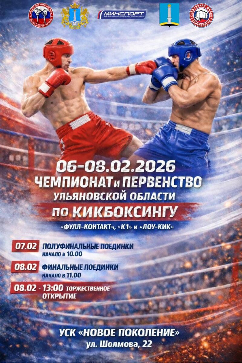 В спорткомплексе «Новое поколение» с 6 по 8 февраля будет проходить Чемпионат и Первенство Ульяновской области по кикбоксингу. Спортсмены будут соревноваться в дисциплинах фулл-контакт, к-1, лоу-кик. Канал «Ульяновск сегодня» в MAX