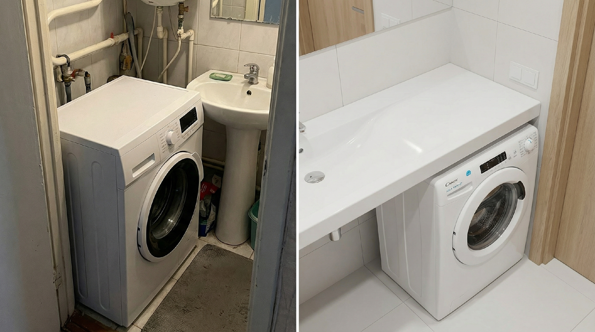 Для студии или малогабаритки нужна КОМПАКТНАЯ или УЗКАЯ стиралка — иначе просто не влезет. Обычная стиралка 60 см глубиной займёт половину ванной.