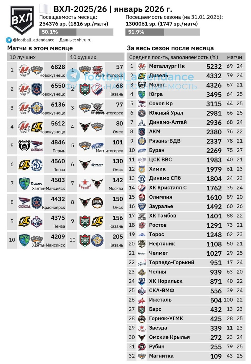Средняя аудитория одного матча «Вышки» в январе (1816 зр./матч) была на 4% выше, чем средняя в сезоне (1747). Посещаемость месяца Заполняемость стадионов Не забывайте подписаться на канал здесь на Дзен и в Телеграм! Также вы можете отблагодарить мою работу донатами на главной странице канала!